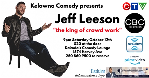 Kelowna Comedy is excited to present the king of crowd work, Jeff Leeson! Jeff is unlike any stand up comedian working today. With a perfect blend of traditional stand up comedy and long form improv he takes the audience on a journey with him while they witness the show not just being performed but being created right in front of there eyes. something that must be seen live to be believed.Jeff’s off the cuff, improvisational style leaves crowds not only wanting more, but stunned at what they just witnessed. Jeff has been described as a one of a kind performer and is certainly one you do not want to miss!Jeff’s stand up has been featured on Sirius/XM radio, The Bob & Tom Show (WGN), Spotify & i-Tunes. He has appeared on CBC, CTV and has a full comedy special on Amazon Prime with another one coming out this year!