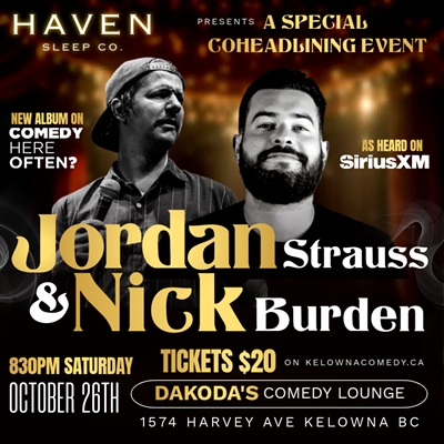 Join us for a night of top-notch comedy as Haven Sleep Co. presents Jordan Strauss and Nick Burden at Dakoda’s Comedy Lounge! Jordan, fresh off releasing his new album on 604 Records and headlining the Kelowna Comedy Festival, brings his sharp wit and high-energy style to the stage. Co-headlining is Nick Burden, an internationally touring comic from Ottawa known for his fearless humor, exceptional crowd interactions, and celebrated one-man show Internationally Wanted, Locally Hated, which has toured 10 countries. Don’t miss this dynamic duo in what promises to be an unforgettable night of laughter!