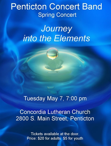 <p>PENTICTON CONCERT BAND is pleased to announce our Spring Concert: ‘Journey into the Elements’ on May 7th. <br /> From upbeat and celebratory marches to renaissance music and pop hits, there is sure to be something for all the music lovers in the audience. This concert title pays homage to one of the pieces titled “Elements”, by one of the composers the band really enjoys playing, Brian Balmages. This beautiful piece is made up of four exciting and breathtaking movements representing Air, Water, Earth and Fire. John Mackey composed another unique piece in this concert: ‘Foundry’, an imaginative and fascinating percussion-focused piece that will show the audience that ordinary objects can serve the purpose of a percussion instrument. What ‘instruments’ might we be playing in this piece? As an interesting side note, this concert which will feature pieces by six composers named John! <br /> Did you know? Our band has recently grown, having welcomed dedicated and talented high school-aged musicians. We can truly say the band spans all ages, from 13 to 85; we are proud to be such a true musical community! We look forward to playing our brand new music for you. <br /> SPRING CONCERT: “Journey into the Elements” <br /> A 2 hour show of a variety of musical pieces by The Penticton Concert Band</p>