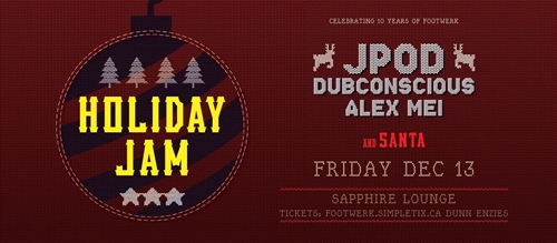 <p>on sale now –> http://footwerk.simpletix.caor visit DunnEnzies Pizza Co. on Ellis for hard copies soonJPOD the beat chef pushes the limits of smiles per minute with his musicality that pays respect to vintage sounds of the past while forging into unexplored soundscapes of the future. DJ Dubconscious, Alex Mei, and SANTA join us for our 10th+ annual Holiday Jam. Celebrate 10 yrs of Footwerk Events shows in the #okanagan all fall at the intimate Sapphire Lounge in Kelowna BC. Vibe by: YOU! Grab tickets, bring your friends, get weird. DRESS THEME: HOUSE COAT HOLIDAY JAM. Wear your robe, house coat, kimono, or cape and enter the magic and vibes. DO NOT BRING FLOW TOYS. thanks- – – – – – – – – – – – – – – – – – – – – – – ITINERARY OF FUN– MAIN –1245 – 0200 — JPod1130 – 1245 — Dubconscious1000 – 1130 — Alex Mei- – – – – – – – – – – – – – – – – – – – – – –</p>