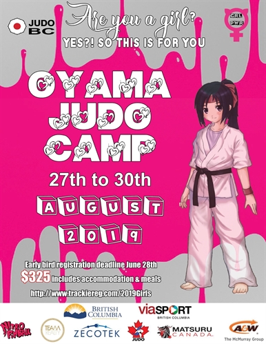 Judo BC Sponsored Summer Camp: Registration is now open for the 6th Annual Judo BC Girls Summer Camp in the sunny Okanagan. Judo BC invites all female judoka to attend. This fun filled camp explores leadership, positive self-esteem, and physical activity through the guiding principles of Judo.Registration Link:https://www.trackie.com/online-registration/event/2019-girls-summer-camp/32653/Dates – August 27 (1 pm) to Aug 30 (1 pm)Location – Oyama, BCAge – Females ages 11 and up.Belt Level: Minimum orange beltCosts – Follow registration link, includes all camp activities, meals and accommodations.Transportation: Families/Clubs are responsible for arranging transportation to and from the camp.Registration Deadline – August 20, 2019Clubs that register 4 or more participants will be invited to send a female coach at no cost.Questions? contact Judo BC at info@judobc.ca