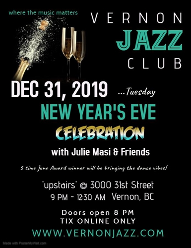 5 TIME JUNO AWARD WINNER JULIE MASI TO RING IN 2020 AT THE VERNON JAZZ CLUB’S NEW YEAR’S EVE CELEBRATION.Now based in Kelowna Julie collaborates with Steve Soucy, the valley’s most versatile keyboardist and arranger. They will be joined by drummer Scott Gamble, a remarkable rhythm master; guitarist extraordinaire, Mark Larmand and special guest Jacob Soucy on trumpet.Julie & Friends New Year’s Eve Celebration promises to be a memorable evening with popular dance music and favourite hits from the 80’s & 90’s as well as a few original compositions.Get your tix, polish your dancing shoes and join us to ring in 2020!Buy your tickets soon online at www.vernonjazz.comTickets are $60 and includes hot and cold appetizers, dessert, party favours and a glass of champagne to ring in the New Year!!????Doors open at 8 pm, show 9 – 12:30 amCash only bar. No minors.lemonay.com