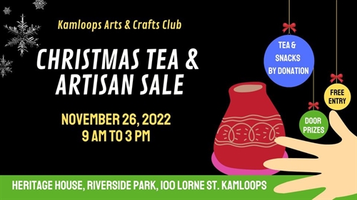 <p>Kamloops Arts & Crafts Club’s annual Christmas Tea & Artisan Sale<br />November 26, 2022<br />9am to 3pm<br />Heritage House at Riverside Park – 100 Lorne Street, Kamloops<br />Paintings, pottery, weaving, felting, toys, jewelry, ornaments, cards and more!<br />Free admissions, door prizes, tea & snacks by donation<br />Cash, visa, debit, Mastercard accepted</p>