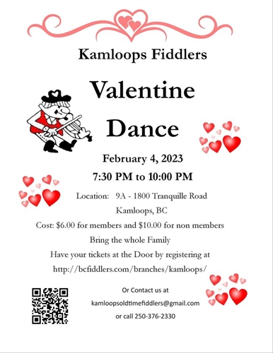 <p>Kamloops Fiddlers<br />Valentine<br />Dance<br />February 4, 2023<br />7:30 PM to 10:00 PM<br />Location: 9A – 1800 Tranquille Road<br />Kamloops, BC<br />Cost: $6.00 for members and $10.00 for non members<br />Bring the whole Family<br />Have your tickets at the Door by registering at<br />http://bcfiddlers.com/branches/kamloops/<br />Or Contact us at<br />kamloopsoldtimefiddlers@gmail.com<br />or call 250-376-2330</p>