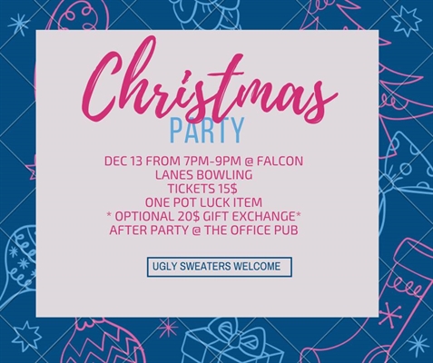 Join us for our Christmas Party at Falcon Lane Bowling. Tickets are 15$ for shoes and unlimited games of bowling. This will be a potluck style party and we will have an optional 20$ gift exchange. Alcohol can be purchased at Falcon Lanes and the after party will be at The Office pub. This is an adult and teen members only event. Ugly Sweater are welcome! Please sign up for a potluck item and purchase a ticket at the gym.