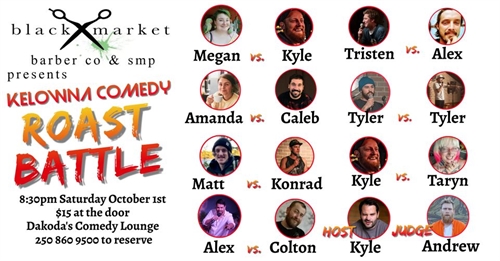 <p>Come see Kelowna Comedy’s top comics rip each other apart for the fun of it. Its mean,its nasty, and its hilarious! Eight battles. One winner. Hosted by the KING OF STING Kyle Vestner and judged by the HONOURABLE Andrew Crone. Each comic gets 5 jokes. Its head to head. No holds barred. Featuring Amanda Rose vs Caleb Campbell. Taryn Anderson vs Kyle Ferris. Kyle Ferris vs Megan Moore. Tyler Drewek vs Tyler Girdwood. Matt Atkins vs Konrad Anderson. Tristen Bright vs Alex Kovaks. Only one will rise.<br />Thanks so much to our generous sponsor, Black Market Barber & SMP. Check them out and support them for supporting us. <br />Tickets<br />https://www.eventbrite.ca/e/kelowna-comedy-roast-battle-presented-by-black-market-barber-co-smp-tickets-407167417707?aff=ebdssbdestsearch</p>