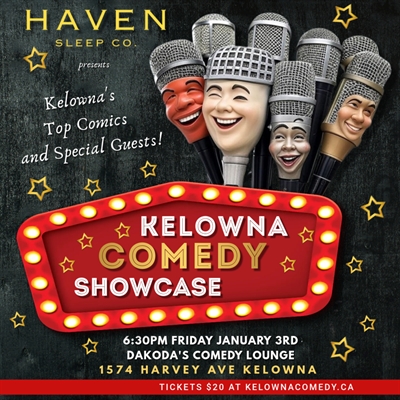 <p>Haven Sleep Co presents the Kelowna Comedy Showcase, a night of top-notch stand-up comedy featuring three special guests from Vancouver and some of Kelowna Comedy’s finest performers. Join us at Dakoda’s Comedy Lounge on Friday, January 3rd, for an unforgettable evening of laughter. Doors open at 6:00 PM, and the show starts at 6:30 PM. This event promises a diverse lineup of talent delivering sharp wit, relatable stories, and nonstop laughs in the intimate and lively atmosphere of one of Kelowna’s favorite comedy venues. Don’t miss your chance to experience the magic of live comedy—grab your tickets now!</p>