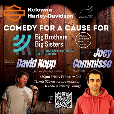 Get ready for an uproarious evening of laughter as Harley-Davidson Kelowna proudly presents “Comedy for a Cause” in support of Big Brothers Big Sisters of Central and Southern Interior of BC. Hosted by the charismatic David Kopp, founder of Kelowna Comedy, this event promises an unforgettable night filled with side-splitting humor. Headlining the show is the incredibly talented Joey Commisso, a familiar face from Just for Laughs Vancouver, who is set to deliver a performance that will leave you in stitches. Joining him on stage will be a lineup of Kelowna Comedy’s finest comedians, ensuring non-stop laughs and an electrifying atmosphere. Mark your calendars for a night of great entertainment, all while supporting a worthy cause that makes a positive impact in the community. Don’t miss this unique opportunity to indulge in laughter and contribute to the vital work of Big Brothers Big Sisters. Thanks so much to Kelowna Harley-Davidson for their generous support.