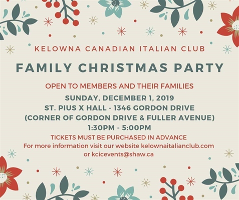 This event is open to KCIC members and their families. Tickets must be purchased in advance and there are only a limited number available. This event will be a SELL OUT!For more details visit our website kelownaitalianclub.com or email us at kcicevents@shaw.ca