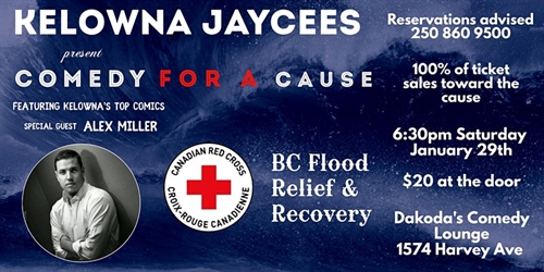 <p>The Kelowna Jaycees are excited and proud to present Comedy for a Cause for the Canadian Red Cross’s BC Flood Relief Efforts. This fun night of laughs will feature Kelowna Comedy’s top talent including a special performance from Alex Miller!We will be donating 100% of ticket sales to the cause.This is where we would put a bio of the comedian and get you all hyped up to see him. We would list all of the cool comedy festivals he has performed at and all the awards he’s won. Alex has done none of those things. We honestly don’t now how he ended up on this show. It’s probably some sort of clerical error. We’re “fairly” confident it will be better than Fire Fest or dinner with your in-laws….Alex wrote that last part. He is just being humble. He is very funny. Come to the show.JCI Kelowna is a group of young professionals and entrepreneurs, ages 18-40, that strive to grow as individuals while positively impacting our community, Kelowna, BC. Established in 1935, the Kelowna Jaycees have a rich history and are one of the city’s oldest professional groups.We are focused on personal development and leadership by taking on local projects and events, and by participating in training and network opportunities. Our unit promotes fun and camaraderie throughout these activities.</p>
