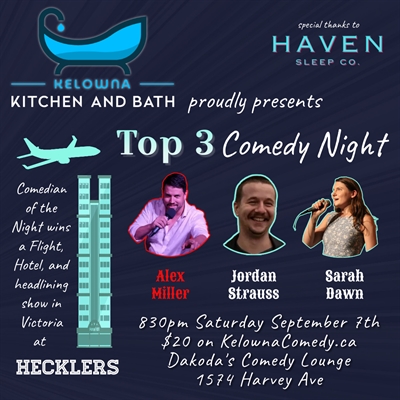 <p>Prepare yourself for an unforgettable night of laughter at “Top 3,” the premier comedy showdown presented by Kelowna Kitchen & Bath. On Saturday, September 7th at 8:30 PM, the stage will come alive with side-splitting performances from three of the sharpest comedians: Jordan Strauss, Sarah Dawn, and Alex Miller.This isn’t just any comedy show—it’s a fan-favorite competition where you get to decide who takes home the crown. Jordan Strauss will have you roaring with his sassy, no-holds-barred humor, while Sarah Dawn’s witty observations on everyday life will leave you in stitches. And don’t miss Alex Miller’s quick-fire, outlandish wit that promises to keep you on the edge of your seat.The stakes couldn’t be higher—the winning comedian walks away with a luxurious prize: a flight, hotel stay, and a performance at Victoria’s renowned Heckler’s Comedy Club! The competition is fierce, the laughs are guaranteed, and the memories will last long after the night is over.Kelowna Kitchen & Bath, alongside Haven Mattress Co., is proud to bring this epic event to life. Be sure to arrive early, cast your vote, and make your voice heard in deciding the funniest of the night. And don’t forget to check out Kelowna Kitchen & Bath’s stunning new showroom on Banks Road. We can’t wait to see you there!</p>