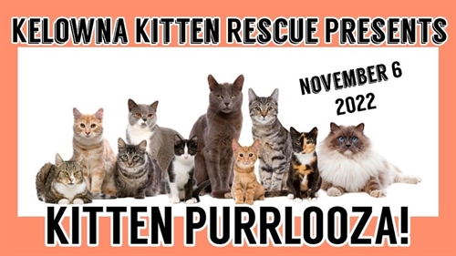 <p>KELOWNA KITTEN RESCUE PRESENTS KITTEN PURRLOOZA!<br />Sunday, November 6th<br />11am-2pm<br />At Homes Alive Pets Kelowna<br />Kittens! Young moms who are still kittens themselves! Older kittens! All kinds of kitties looking for loving homes. All are loved, healthy and happy kittens from our foster families who will also be in attendance to answer your questions.<br />So many kittens to choose from!!<br />**Please keep doggos away from cages.</p>