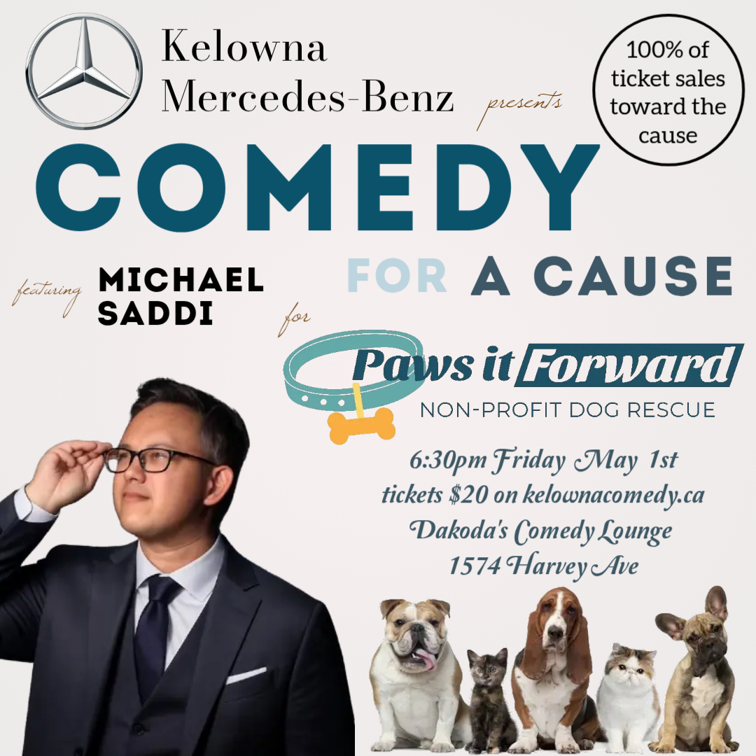 Join us for a night of big laughs and real impact as Kelowna Mercedes-Benz of Sentes Automotive proudly presents Comedy for a Cause in support of Paws It Forward.This special event brings together top-tier stand-up comedy and a cause that truly matters. 100% of ticket sales go directly to Paws It Forward, a dedicated local non-profit that rescues, rehabilitates, and rehomes dogs in need—from overcrowded shelters and difficult situations to remote communities with limited access to care. Every ticket helps give a deserving dog a second chance at a safe, loving forever home.Headlining the night is Michael Saddi, a standout comedian known for his sharp, quirky, and effortlessly smart style. A Filipino-Indian comic with a bold, honest voice, Michael delivers hilariously relatable material about family, culture, and everyday life. A seasoned international performer, he has shared the stage with comedy heavyweights including Neal Brennan, Ahmed Ahmed, and Sean Patton. With razor-sharp wit and a natural ability to win over any crowd, Michael is guaranteed to bring the house down.A heartfelt thank you to the Sentes Group for making this night possible. Visit any of their four licensed dealerships across the Interior.Get your tickets now and help us fill the room with laughter, compassion, and community spirit. Come for the comedy—stay for the cause. Your support truly saves lives.