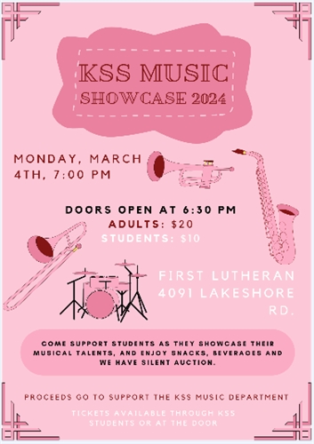 You’re invited to attend the 2024 KSS music showcase!Doors open at 6:30First Lutheran – 4091 Lakeshore RdAdmission:Adults $20Students $10Tickets available at the door or from KSS Music Students.*All proceeds go to supporting the KSS Music DepartmentJoin us in supporting our Kelowna Secondary School Music Students, as they showcase their musical talents.This fundraising event will have a silent auction and light concessions.
