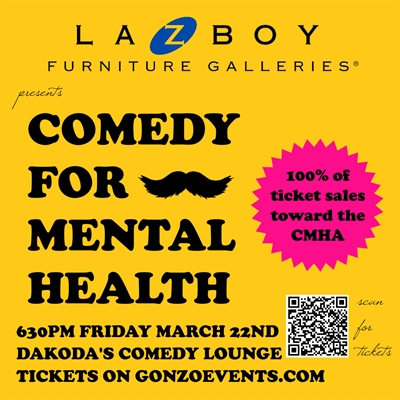 <p>Join us for an evening of laughter and support at “Stand Up for Mental Health” presented by LaZboy Furniture Galleries in Kelowna. On Friday, March 22nd, at 6:30 PM, head over to Dakoda’s Comedy Lounge for an unforgettable night featuring Kelowna’s top comedians.By purchasing tickets, you’re not only in for a hilarious time but also contributing 100% of the ticket sales to the Canadian Mental Health Association. Your presence helps fund vital mental health programs in our community, breaking down stigma and fostering positive change.Don’t let this opportunity for comedy and impact pass you by. Secure your tickets now to be part of a night that’s not only entertaining but also meaningful. Thanks to our sponsor, LaZboy Furniture Galleries, for their generous support in making this event possible. Let’s come together for laughter that truly matters.</p>