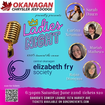 <p>Get ready for a night of laughter and generosity as Okanagan Dodge presents Ladies Night for the Central Okanagan Elizabeth Fry Society! Join us for a comedy show fundraiser featuring Kelowna’s top comics, guaranteed to bring the house down with their hilarious performances. Every penny from ticket sales goes directly to the Central Okanagan Elizabeth Fry Society, an incredible organization dedicated to supporting women and children in our community who are facing poverty, violence, and injustice. Don’t miss this fantastic opportunity to enjoy an evening of top-notch entertainment while making a real difference. A huge thank you to our generous sponsor, Okanagan Dodge, for making this unforgettable night possible!</p>