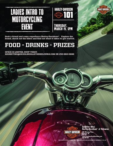 This ladies only H-D 101 Intro to Motorcycling is a great way to learn about Harley-Davidson® and the bikes that have made us famous! Grab some friends and join us to explore the brand, check out the bikes and find out what it takes to get started. Discover the products, accessories, gear and interact with experienced women riders in our community. Food, drinks and prizes will make this an event that you don’t want to miss! Call Jenn at 250-860-0666 to register today!