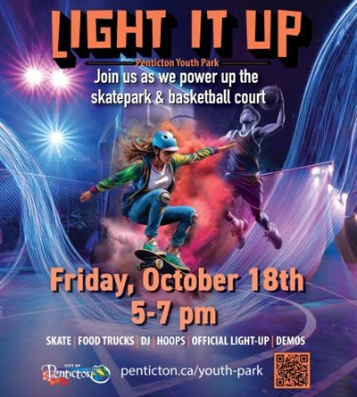 <p>Let’s light up the new outdoor lights at Penticton Youth Park! Join us for this opening celebration, with a DJ, food trucks, skateboarding, BMX biking and a basketball showcase.The event begins with a three-on-three basketball showcase hosted by Lake City Basketball, followed by an open skate and BMX ride, as well as the official light-up.Representatives from local bike and snowboard shops will be on-site and taking part in the open skate event. <br />Free to attend! Open to everyone. See you there!</p>