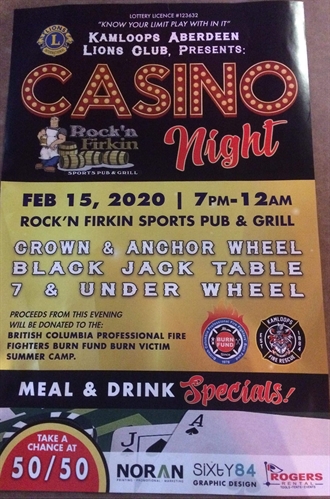 Kamloops Aberdeen Lions Club presents: Casino Night at the Firkin!Crown and Anchor Wheel Black Jack Table7 and Under WheelProceeds this evening will be donated to the: British Columbia professional fire fighters burn fund burn victim summer camp!Ladies come let these steamy fireman put out your fire!!