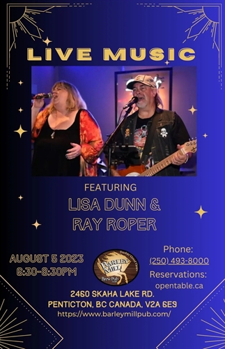 <p>Live music on the patio! We Love Patios & Live Music!Saturday, August 5, 6:30-8:30 — Lisa Dunn & Ray Roper, and featuring Prime Rib Dinner!Keep posted for upcoming live music on the patio all summer long!No cover! Reservations Welcome!Book your reservation now — 250-493-8000</p>