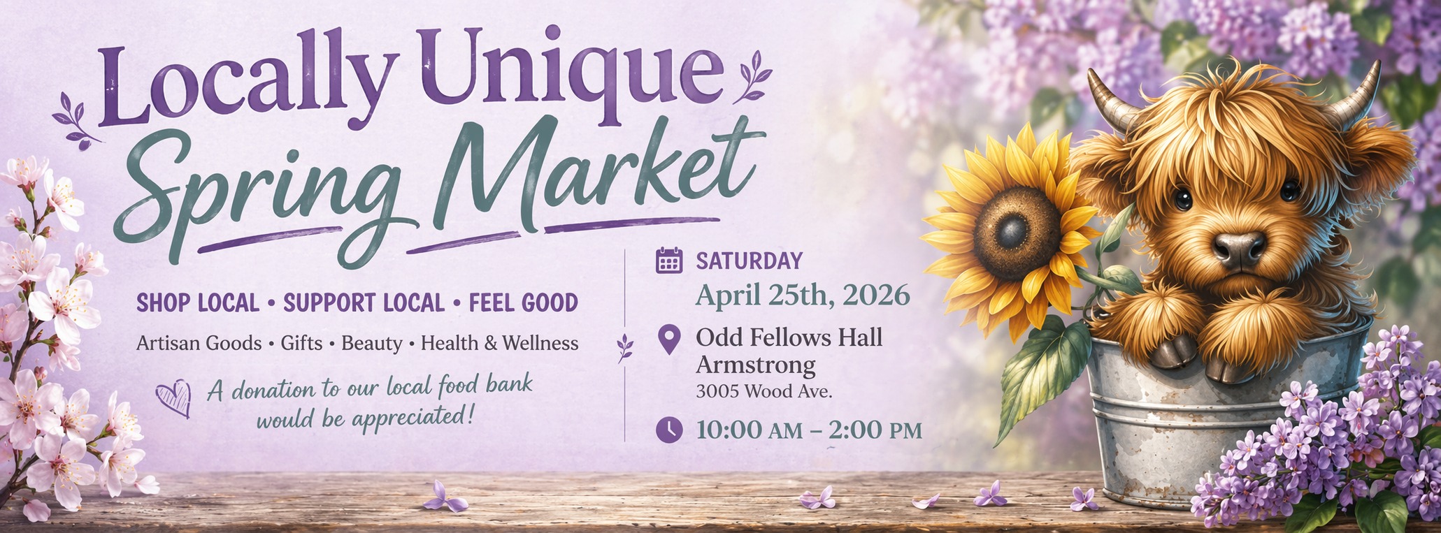 Join us for a beautiful spring day celebrating local makers, wellness, and all things unique! Browse a thoughtfully curated market filled with artisan goods, gifts, beauty products, and health & wellness offerings—all from talented local vendors. It’s the perfect chance to shop local, discover something special, and connect with our amazing community Saturday, April 25, 2026 Odd Fellows Hall, Armstrong (3005 Wood Ave.) 10:00 AM – 2:00 PM Admission is by donation — with proceeds supporting our local food bankBring a friend, enjoy the atmosphere, and support local