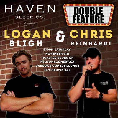 <p>Join us for Haven Sleep Co presents Logan Bligh and Chris Reinhardt on Saturday, November 9th at 6:30 PM at Dakoda’s Comedy Lounge!Logan Bligh, at 23 and a half years old, has already taken the comedy world by storm, with performances at the Kelowna Comedy Festival and Vancouver’s renowned Comedy Underground. He’s the winner of Comedy Bloodsport and the Fraser Valley Comedy Competition.Your second headliner, Chris Reinhardt, has also made a name for himself at Comedy Underground in Vancouver, hosted the Kelowna Comedy Festival, and claimed victory at the Ogopogo Comedy Challenge. He’s currently saving up for a face tattoo of his favorite Pokémon, so you know he’s serious about making you laugh!With a combined age of 43 and a total weight of 320lbs, these comedians are ready to deliver a night of unforgettable comedy.A big thank you to Haven Sleep Co for sponsoring this event and supporting live comedy! Don’t miss out on the laughs—get your tickets now!</p>