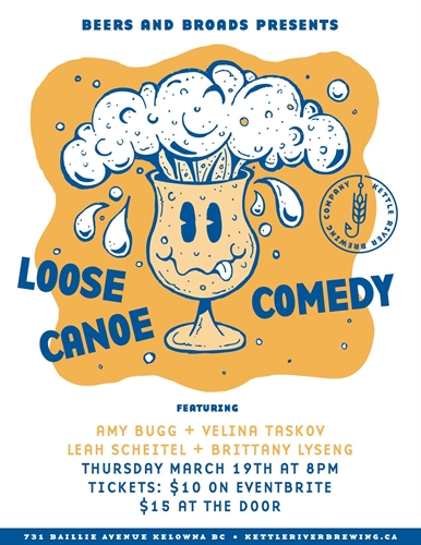 Beers & Broads Comedy and Kettle River Brewing are proud to present LOOSE CANOE COMEDY! Featuring four of Western Canada’s funniest ladies – Brittany Lyseng, Velina Taskov, Amy Bugg, and Leah Scheitel. Come have a good pint and a giggle with these broads who just love beer. Thursday, March 19th at 8 p.m.Tickets $10 on Eventbrite or $15 at the door. TICKETS HERE: https://www.eventbrite.ca/e/loose-canoe-comedy-tickets-96987039847