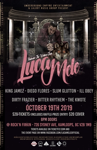 Unleash The Wolves! Luca Mele’s 7th tour since 2015, spreading his message of unity and justice, as the crowd gets fueled and hyped to a night of good music and free meet and greets.Luca Mele is also the singer of No Assembly Required(Rock Band)who’s music made Canadian history 3 times as the only unsigned artists to get heavy rotation on Canadian television programs like Much Music and Much Loud and Much On Demand. The music is still featured weekly on The Fight Network, a channel that airs UFC events.Luca Mele has released 4 solo albums in the last 3 years and toured with big acts Tech 9, Merkules, and Onyx.Luca Mele has been featured on Media outlets such as; this is 50.com. Canadian Hip Hop.com, and Krazyboy Radio for 5 million listeners.Luca Mele has acquired some features in his music such as with Eminem’s Shady Records D12’s Bizarre. BMG/RBC’s Merkules. And with Demrick of Serial Killers(B-real of Cypress Hill, Xzibit)https://youtu.be/w4xtCpulTQkInstagram @Lucamele1—–