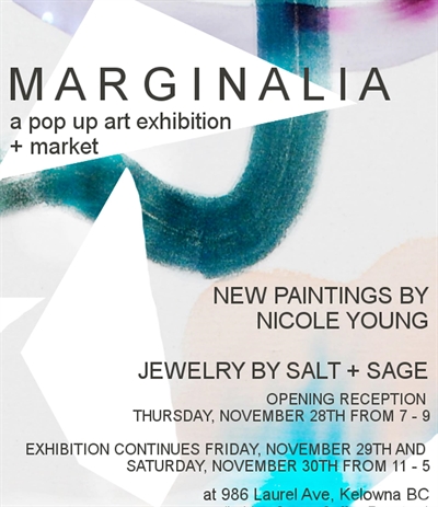 <p>Nicole Young and Salt + Sage Jewelry have teamed up for a weekend pop-up art exhibition and jewelry market! Located at the Courtney Ungaro Space and Design Studio at 986 Laurel Ave, Kelowna, BC (behind Canoe Coffee Roasters.)The exhibition and market starts with an opening reception on Thursday, November 28th from 7 pm to 9 pm. Enjoy snacks and refreshments while viewing brand new paintings by Nicole Young, and the latest collection of jewels from Salt + Sage. The exhibition and market will continue on Friday, November 29th and Saturday, November 30th from 11 am to 5 pm. This event is completely free and open to the public. Bring your friends!For more info about Salt + Sage:https://saltandsage.ca/For more info about Nicole Young:http://www.nicoleyoungart.com/Marginalia are marks made in the margins of a book or other document. They may be scribbles, comments, critiques, doodles, or illuminations. This exhibtion is titled as such because I am constantly making notes, scribbles and doodles in sketchbooks, my phone, and random scraps of paper. These notes are often completely out of context, referring to an idea of colour combinations or compositions that pop into my head at unexpected moments. Each painting in this pop up exhibition is a new work based on one of these out of context marginalia notes.</p>