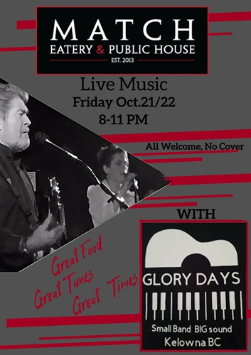 Live music event at Match Eatery at the Playtime Casino located in the Delta Hotel downtown Kelowna featuring Glory Days Duo – great food, great tunes, great time! No cover – everyone welcome.