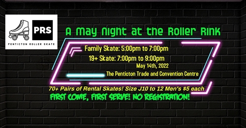 Penticton Roller Skate is excited to share with you our next Night at the Roller Rink!We will be offering 2 skating blocks:5:00pm to 7:00pm – Family SkateSkaters 13 and younger require helmets. Skaters to supply their own helmets.7pm – 9pm – 19+ SkateAdmission:13 and younger $10.00 each14 and older $15.00 eachFinancial Assistance available for those that face barriers in accessing events.Skate Rentals: $5.00 per pair.Roller Skate, or Blades Welcome.No bikes, scooters, or skateboards.Admission and skates are first come, first serve