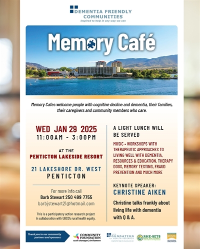 A Memory Café designed to support individuals living with dementia, their families, caregivers, and community members. The event will feature complimentary light lunch, live music, engaging workshops, therapy dogs, memory testing, cognitive health resources, tips on navigating dementia care, educational materials, and a keynote speaker. Hosted as part of a participatory action research project in collaboration with UBCO’s Rural Health Equity initiative.