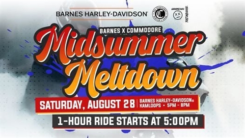 Barnes Harley-Davidson® Kamloops and The Commodore Present: Midsummer MeltdownJoin us on Saturday, August 28th, for a group ride! When you get back to the dealership, we’ll have food trucks, a beer garden, music, raffles, giveaways, and a STUNT SHOW waiting for you.Schedule of Events5:00pm – Kickstands up for group ride5:30pm – Beer Garden Opens7:00pm – Stunt Show7:30pm – Announcing winners of the raffleRSVP today!