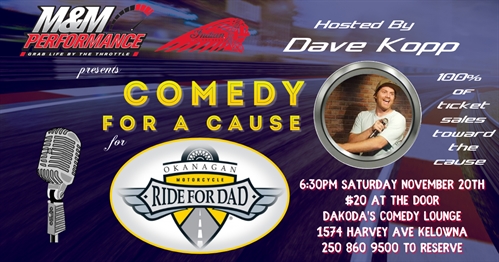 <p>M&M Performance is excited to present Comedy for a Cause for Ride for Dad.This exciting night of comedy will feature Kelowna Comedy’s top comics including our host, David Kopp. David is the founder of Kelowna Comedy, has toured across Western Canada, and has even perfomed on Just for Laughs Northwest. This show will have something for everyone with eight comedians presenting their best material.Ride For Dad helps raise funds to save men’s lives by supporting prostate cancer research and raising public awareness of the disease. Our goal is for men to continue to be there for their families and friends for years to come. The parade of vehicles grabs the attention of the masses and the media on.Thank you to M&M Performance for their generous support.</p>