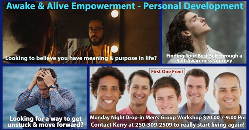 Every second Monday night there is a personal development men’s drop-in group workshop from 7-9:00 Pm. It is a great safe place for men to open up & explore emotional intelligence & find who they are. The groups will help men to either get unstuck or find new ideas for helping them move forward as they find the best part of themselves through self-awareness teachings & discussions. It is a place where men can be encouraged & encourage other men to be on fire with passion, meaning & purpose & live more positive fullfilling lives. Contact Kerry Zubot by Pm or 250-309-2509 to RSVP or for more info.