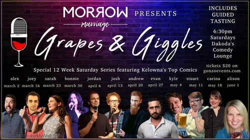 <p>Join Morrow Marriage for a fantastic night of top-notch comedy and delicious wine at Dakoda’s Comedy Lounge! Our Wine Tasting Comedy Show brings together the best wines from Haywire Organic Winery and the funniest comedians from Kelowna.Enjoy the fantastic flavors of Haywire’s wines while laughing along with our handpicked comedians. Whether you’re a wine lover or just love a good laugh, this event has something for everyone.Every Saturday for the next twelve weeks, we have a special comedian lined up. This week, it’s Andrew Crone! Andrew is an award winning comedian and has performed on JFL Northwest and his debut album on Comedy Here Often has taken off like a rocket.Get ready for an evening full of laughter and good times with your friends, family, or coworkers at Dakoda’s Comedy Lounge. Don’t miss out on the fun – thanks to Morrow Marriage for making it all happen! Please follow them on social media for helpful marriage advice.</p>