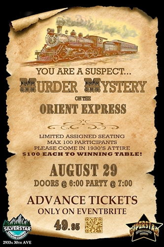 The Silverstar Brewing Co. & Superstar Entertaiment Services invite you to use your detective skills to discover the identity of the murderer, on Thursday Aug 29. Doors open at 6pm Sharp Party Starts at 7pm, Please come in 1930’s Attire!