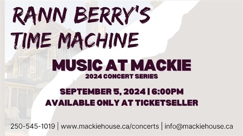 <p>We’re closing out the 2024 Music at Mackie Summer Concert Series with our friend Rann Berry and his infamous Time Machine! Join us as Rann takes us all on a musical journey to share iconic tunes from the 1960s to the 1980s. <br />Visit their site: https://rannberry.com/the-time-machine <br />*All Music at Mackie events are: Bring Your Own Chair! This is an outdoor event—please dress accordingly for a summer evening in the Okanagan. There are no pets permitted on site. <br />This event includes a cash bar and concession. Mackie Lake House is a registered charity and not-for-profit, as well as a national heritage site. All proceeds from this event help us to uphold our mandate: to preserve and present the building, grounds, furnishings, and related history of Mackie Lake House for the enjoyment and education of the public. <br />$40 Per PersonIncluding Fees & Taxes</p>