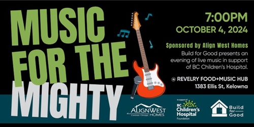 <p>Join us Friday October 4, 2024 at 7:00 pm for a night of incredible live music, rock’n through decades at Revelry Food + Music Hub, in support of BC Children’s Hospital. <br />Get ready to groove to the beats with a new, locally formed Kelowna band who will showcase their talents in support of this BC Children’s Hospital Fundraiser. Band members are David Pfuetzner and Jordan Hansum (Align West Homes), Grant Petkau (Kelbrook Construction), and Jarrett Boyetchko (Ace Project Marketing Group). Whether you’re a music enthusiast or just looking for a fun night out, this event is perfect for everyone. <br />Ticket price includes a welcome drink, food and a great evening of live music. Tickets can be purchased at Music For The Mighty Tickets, Fri, 4 Oct 2024 at 7:00 PM | Eventbrite <br />Money raised from this event will go towards the Social Work Fund of BC Children’s Hospital.</p>