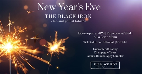 On December 31st The Black Iron Club & Grill at Tobiano will be having a New Year’s Eve celebration. Doors open at 4 PM and fireworks will begin at 9 PM. Ticket’s include: ~ Guaranteed seating~ Champagne toast~ Amuse Bouche Appy Sampler*A la carte dinner not included in ticket price. For more information call (250) 434-5858Menu ~ http://ow.ly/ZxTO50xpWGl