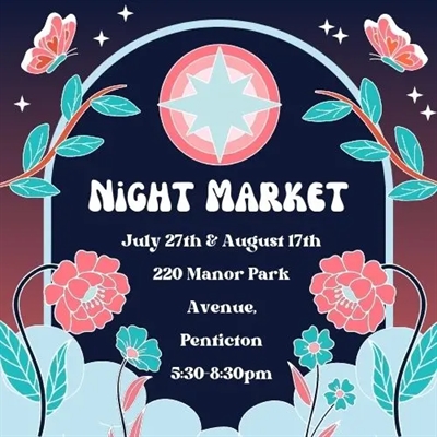 A Night of Art, Fashion, Food, and Culture!Join us for the PDCAC’s inaugural NIGHT MARKETS this summer!Featuring local artisans selling art, clothing, jewelry, and much more, visitors can also wander through the current PDCAC exhibitions and visit our Artist in Residence studios, where our talented AiRs have opened up their workspaces to the public. We’ll have live music, pottery demos, food trucks, and an Artist Trading Card station to enjoy!Where: Leir House @ 220 Manor Park AveWhen: August 17th, from 5:30-8:30For questions or concerns, contact summer@pentictonartscouncil.com