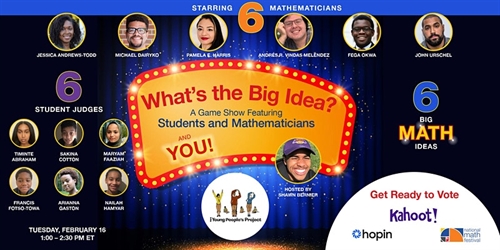 Join the student judges as they — and you! — vote on how well each mathematician conveys a big idea in math. Every vote counts, so come ready to listen and play along.Six mathematicians will take center stage with the single objective of presenting a very big or deep idea in math to a panel of six youth judges.The contest organizers hope this competition calls attention to culturally responsive, grounding, and sustaining approaches to engage young people with mathematics.The Young People’s Project (YPP) uses Math Literacy Work to develop the abilities of elementary through high school students to succeed in school and in life, and in doing so involves them in efforts to eliminate institutional obstacles to their success. NMF Live Game Show – 2021 National Math Festival imageTeachers, here’s your homework!You and your class have some options:Screen share in Zoom + your class plays along in Kahoot. We’ll provide simple instructions ahead of time. (No logins required except your own.)Share the Zoom link (it’s the same for everyone) and let students connect on their own devices. From there they can also play along in Kahoot! Younger students can view the game with their parents.Too much info? Don’t worry, we will send all of this to you in your confirmation email once you register.As ever, the NMF is free and open to the public, with activities designed for all ages, from very young children to adults.We invite you to celebrate the fun, beauty, and power of math through games, puzzles, math, magic, uplifting and intriguing talks, beautiful and engaging films and film panels, live performances, and much more.The National Math Festival is organized by the Mathematical Sciences Research Institute (MSRI) in cooperation with the Institute for Advanced Study (IAS) and the National Museum of Mathematics (MoMath). The 2021 NMF is generously supported by the Simons Foundation, the Alfred P. Sloan Foundation, the National Science Foundation, Schmidt Futures, the Kavli Foundation, and the American Mathematical Society (AMS). NMF Live Game Show – 2021 National Math Festival imageBe sure to register for NMF Live Performance Series (requires separate registration)Tuesday, January 12, 2021 (1:00 – 2:00 pm ET): Math Rap (Double Feature): Music Notes and Professor LyricalWednesday, January 27, 2021 (1:00 – 2:30 pm ET): “Witches of Agnesi” Play Performance (Pre-Recorded) and Panel Discussion (Live)Tuesday, February 9, 2021 (1:00 – 2:00 pm ET): Mathical Book Prize 2021 Winners AnnouncementWednesday, March 17, 2021 (1:00 – 2:30 pm ET): Believe-It-Or-Not, It’s Math (x2): Numberphile and Science Circus
