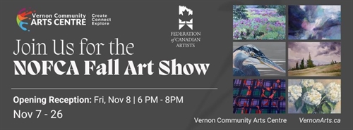 <p>Join us for the Opening Reception – Friday, November 8 | 6 PM – 8 PM <br />We are proud to present works from the North Okanagan Federation of Canadian Artists (NOFCA). <br />NOFCA is a community of over 75 artists from the north Okanagan area, that includes emerging artists through to highly proficient professional artists. Each year the NOFCA holds a juried show at the Vernon Community Arts Centre, which features three prize winning paintings, three honorable mentions, and many more extraordinary works from their talented group of local artists. The quality of works and diversity of art is always a treat for the eyes.</p>