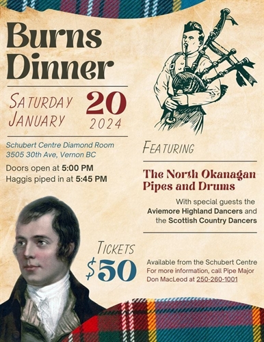 Join us for a night filled with music, dance, food, and all things Robbie Burns, at the North Okanagan Pipes and Drums Burns Dinner! Hosted by the North Okanagan Pipes and Drums, this event will also feature captivating performances by the Aviemore Highland Dancers and the Scottish Country Dancers.