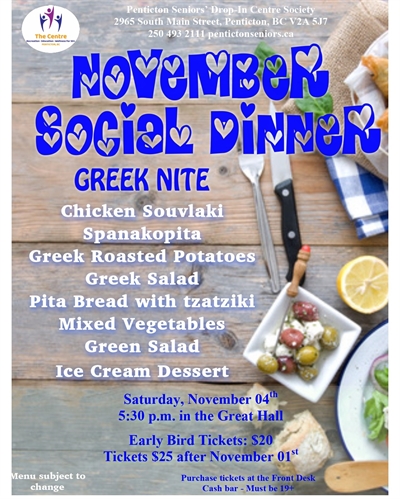 <p>Greek Nite Social Dinner Nov 4 at The Centre, 2965 South Main St Penticton</p>