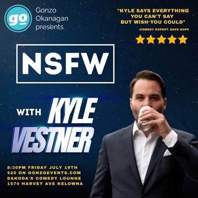 Go headfirst into the wild world of comedy with “NSFW with Kyle Vester,” proudly brought to you by Gonzo Okanagan! This isn’t your average comedy show – it’s a fearless journey into the dark side of humor, where comedians fearlessly tread where others dare not go. Join Kyle Vester and a lineup of daring comics as they unleash jokes that would make your grandma blush and your boss raise an eyebrow. This show is not for the faint of heart – it’s for those brave souls willing to embrace the edgy, the taboo, and the downright naughty. So, if you’re ready to throw caution to the wind and laugh in the face of controversy, buckle up because NSFW isn’t pulling punchlines. Thanks so much to Gonzo Okanagan for their generous support of this huge night of laughs!