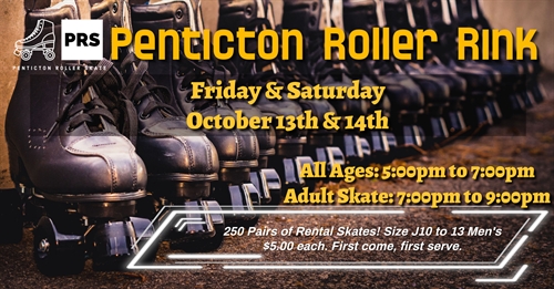 <p>Penticton Roller Skate is back for the fall season!New this fall is back to back skate opportunities! We will be hosting both Friday and Saturday October 13th and 14th!We will be offering 2 skating blocks:Family Skate: 5:00pm to 7:00pmSkaters 13 and younger require helmets.Adult Skate: 7:00pm – 9:00pmAdmission:13 and younger $10.00 each14 and older $15.00 eachFinancial Assistance available for those that face barriers in accessing events.Skate Rentals: $5.00 per pair – Over 250 pairs available.All Skaters must complete our digital waiver prior to skating: https://waiver.smartwaiver.com/w/rckc4uaqthdmlcncrglpqp/web/Roller Skate, or Blades Welcome.No bikes, scooters, or skateboards.Admission and skates are first come, first serve.</p>