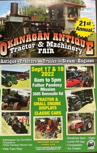 <p>Antique tractors, cars and machinery on display. Something for all ages! Kids train ride. Operating unique gas and steam tractors you seldom seen. Breakfast 8am – 10 am. Lunch all day. Admission by donation. Presented by the Okanagan Antique Power Club and the Vintage Car Club.</p>
