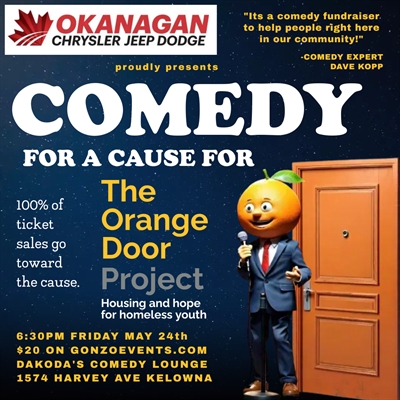 Join us at Dakoda’s Comedy Lounge on Friday, May 24th, at 6:30 pm for a night of uproarious laughter with “Comedy for a Cause” presented by Okanagan Dodge in support of the Orange Door Project. Get ready to chuckle till your cheeks ache as some of Kelowna’s finest comics take the stage, delivering punchlines that pack a comedic punch. With every ticket purchased, you’re not just treating yourself to an evening of hilarity, but you’re also contributing to a meaningful cause – 100% of ticket sales will go directly to the Orange Door Project, helping to provide vital support and resources for those experiencing homelessness in our community. It’s laughter with a purpose, where every joke is a step towards brighter futures. So come on down, bring your friends, and let’s turn laughs into lasting change!