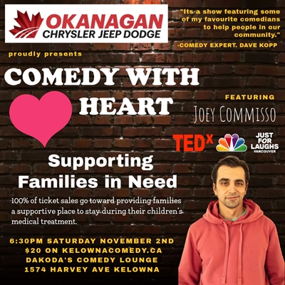 <p>Okanagan Dodge proudly presents “Comedy with Heart,” a special fundraiser dedicated to supporting families in need during their children’s medical treatment. This heartwarming night of laughter will feature some of Kelowna Comedy’s top talent, with 100% of ticket sales going toward providing families with a safe and supportive place to stay while their children receive critical care.Headlining the show is Joey Commisso, a celebrated comedian who has graced stages at NBC, Just for Laughs Vancouver, and TEDx. Known for his quick wit and engaging humor, Joey is guaranteed to bring the laughs while supporting a truly meaningful cause.Join us for an evening filled with laughter, community spirit, and generosity, all while making a real difference in the lives of families in need. A special thanks to Okanagan Dodge for their incredible support in making this event possible!</p>